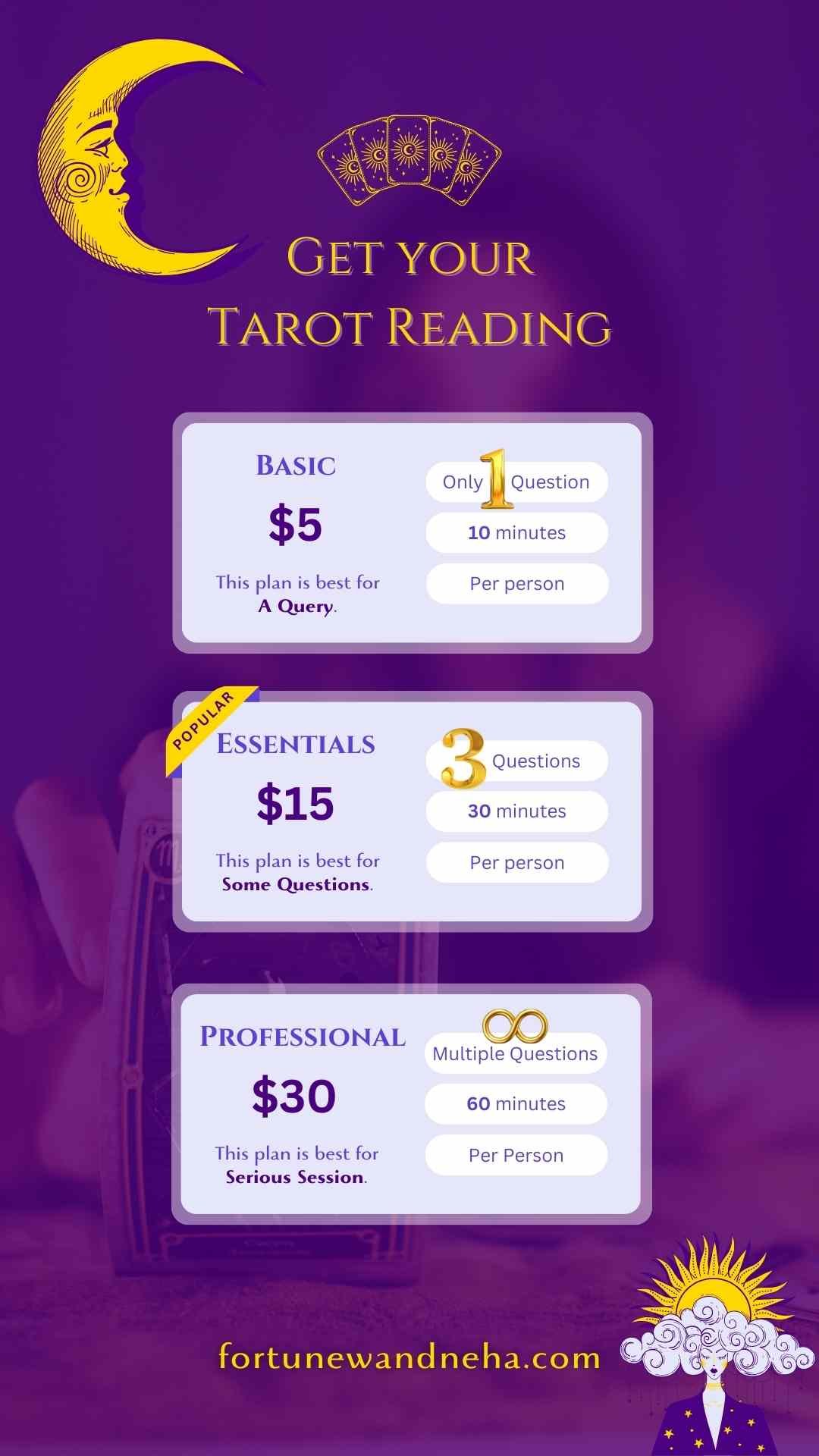 Welcome to Fortune Wand Neha, where intuition meets insight! I am Neha Jella, a passionate and experienced tarot reader, dedicated to helping you navigate lifeโs uncertainties with clarity and wisdom. Tarot is a powerful tool for self-reflection, guidance, and personal growth, and my goal is to empower you with the answers and direction you seek!